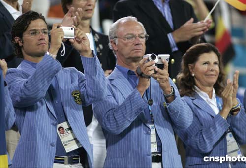 在當(dāng)?shù)貢r(shí)間24日舉行的馬術(shù)障礙賽團(tuán)體賽頒獎(jiǎng)典禮上,瑞典國(guó)王Carl Gustav,王后Silvia和菲利普王子用微型攝像機(jī)拍攝頒獎(jiǎng)的場(chǎng)面。
