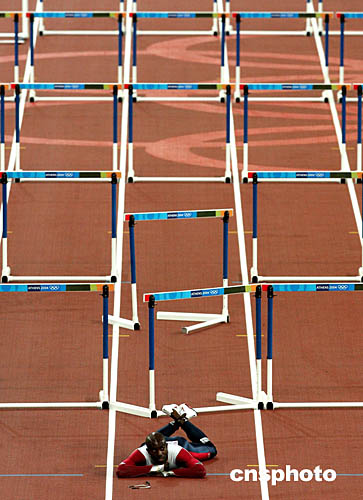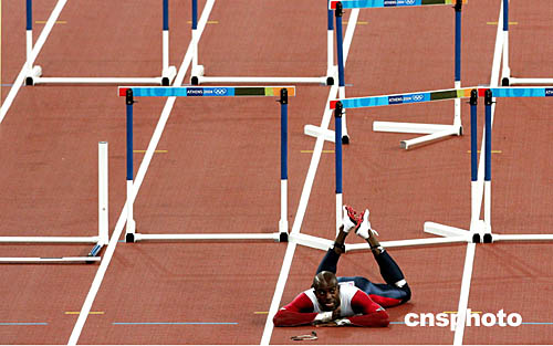 圖為美國(guó)名將阿蘭.約翰遜(Allen Johnson)在男子110米欄的半決賽中摔倒無(wú)緣決賽。