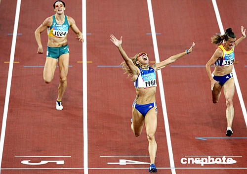圖為希臘選手Fani Halkia戰(zhàn)勝烏克蘭的Tetiana Tereshchuk-Antipova和澳大利亞的Jana Pittman第一個沖過終點,奪得女子400米欄的冠軍。