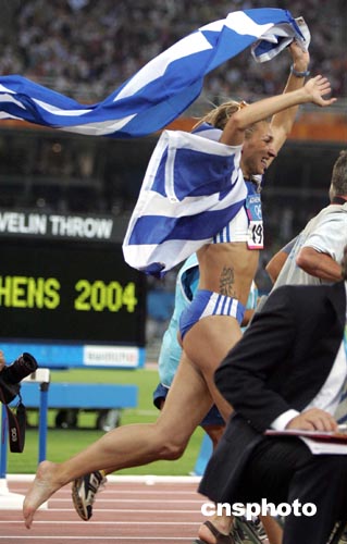 當(dāng)?shù)貢r(shí)間八月二十五日晚,在雅典奧運(yùn)會(huì)田徑女子四百米欄決賽中,希臘選手郝克亞以五十二秒八二的成績(jī)獲得冠軍。中新社記者:毛建軍