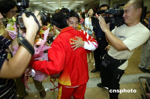 中新社北京八月二十六日電 (記者高凱李靜)首都國際機(jī)場今天再度沸騰,二百二十四名中國奧運(yùn)健兒上午九時(shí)乘坐專機(jī)從雅典返京。