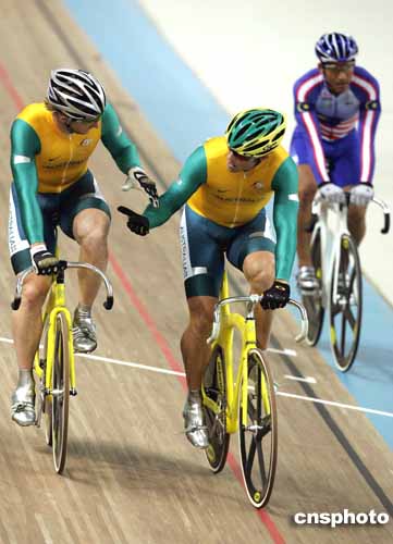 在當(dāng)?shù)貢r(shí)間25日進(jìn)行的男子場(chǎng)地自行車凱林賽中,澳大利亞選手拜雷和凱利分獲金牌與銅牌。圖為他們相互慶祝的場(chǎng)面。