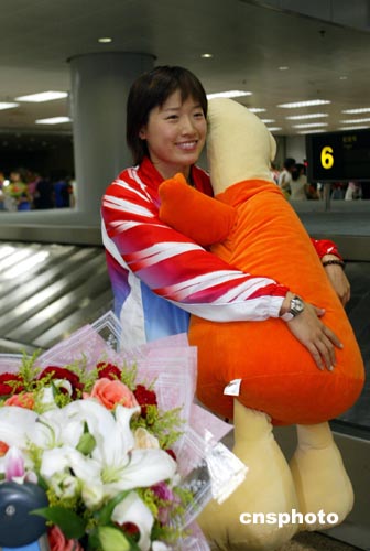 8月26日,北京首都國(guó)際機(jī)場(chǎng)又迎來一批載譽(yù)歸來的奧運(yùn)健兒,包括羽毛球、乒乓球、游泳、體操、舉重等200多名選手,他們受到英雄般的歡迎。幾乎每個(gè)人都被鮮花包圍。圖為在雅典奧運(yùn)會(huì)游泳女子100米蛙泳決賽中奪得金牌的羅雪娟被鮮花簇?fù)碇叱鰴C(jī)場(chǎng)。中新社記者:盛佳鵬