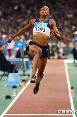 圖為當?shù)貢r間25日,美國著名運動員瓊斯在跳遠比賽資格賽中的表現(xiàn)。