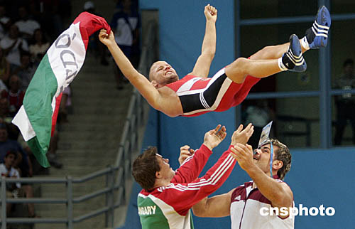 圖為匈牙利選手毛約羅什(Istvan Majoros)在雅典奧運會摔跤男子55公斤級決賽中奪冠后慶祝的場面。
