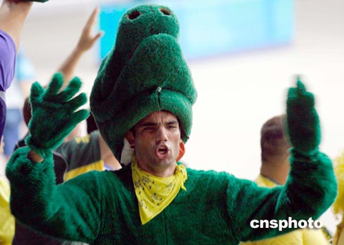北京時(shí)間8月27日凌晨,俄羅斯、巴西女排在雅典奧運(yùn)會(huì)女排半決賽中爭(zhēng)奪進(jìn)入決賽的資格。圖為打扮成“大灰狼”的巴西球迷在為本國(guó)球隊(duì)吶喊助威。中新社記者:張煒
