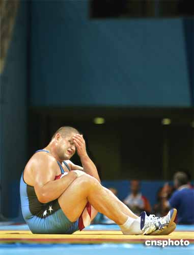 圖為美國選手Rulon Gardner抱著美國國旗坐在比賽場地上,他將在此結(jié)束自己的摔交生涯。當(dāng)把鞋脫下留在毯子上時,他再也難掩內(nèi)心的傷感。