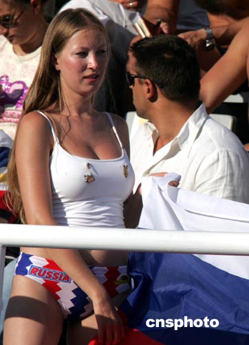 當(dāng)?shù)貢r(shí)間8月27日下午,雅典奧運(yùn)會(huì)男子水球比賽進(jìn)入白熱化階段,志在奪取金牌的俄羅斯隊(duì)(藍(lán)帽)以5比7負(fù)于匈牙利隊(duì),從而無(wú)緣金牌。俄羅斯的球迷人數(shù)雖少,但是熱情四射的女球迷依然奪人眼目。中新社記者:任晨鳴