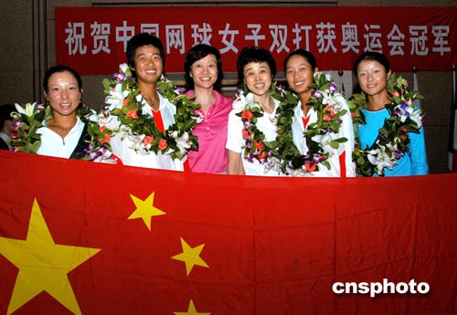 | 在雅典奧運(yùn)會(huì)網(wǎng)球女子雙打決賽中為中國(guó)獲得歷史上首枚網(wǎng)球金牌的李婷、孫甜甜,回國(guó)后立即成為人們的偶像,交際活動(dòng)頻繁。圖為新任國(guó)家體育總局網(wǎng)球運(yùn)動(dòng)管理中心主任孫晉芳(右三)和她的老女排隊(duì)友楊希(左三),帶著李婷(左二)、孫甜甜(右二)在參加一個(gè)歡迎宴前合影留念。作者:王麗南
