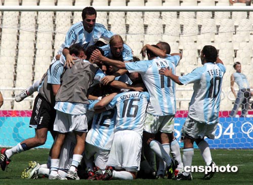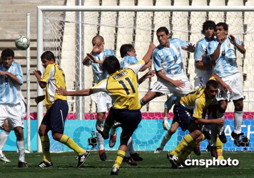 中新社雅典八月二十八日電 (記者 宋方燦)奧運(yùn)會(huì)男子足球比賽今天在雅典謝幕,阿根廷隊(duì)在決賽中以一比0力克南美近鄰巴拉圭隊(duì),奪取金牌。特維茲打入了本場比賽的唯一入球,這也是他在本屆奧運(yùn)會(huì)中的第八個(gè)進(jìn)球。巴拉圭隊(duì)在下半時(shí)兩人被紅牌罰下,最后僅以九人應(yīng)戰(zhàn)。