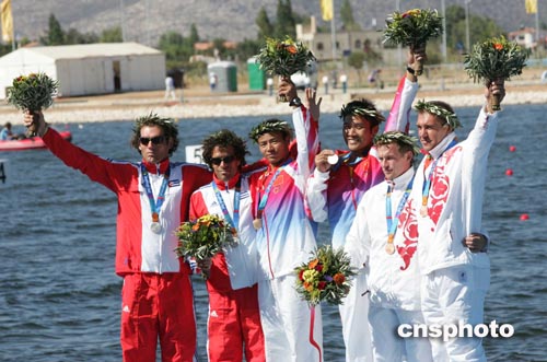 當?shù)貢r間八月二十八日,中國選手孟關(guān)良、楊文軍在雅典奧運男子五百米雙人劃艇比賽中奪得金牌。中新社記者:毛建軍