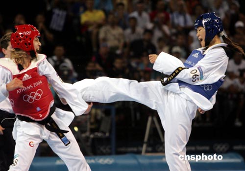 當(dāng)?shù)貢r(shí)間8月28日晚,在雅典奧運(yùn)會(huì)跆拳道女子67公斤級(jí)決賽中,中國(guó)選手羅微擊敗希臘選手獲得冠軍。中新社記者:任晨鳴