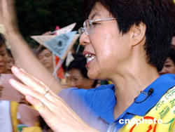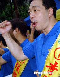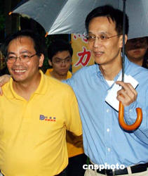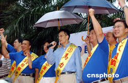 八月二十九日,香港民建聯(lián)舉行2004立法會(huì)選舉誓師大會(huì),剛剛手術(shù)出院的民建聯(lián)主席馬力與港島區(qū)候選人一起在誓師大會(huì)上,為進(jìn)軍2004立法會(huì)選舉造勢(shì)。作者:錢(qián)興強(qiáng)