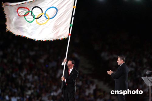羅格說,“四年后,讓我們在北京相聚。”他從雅典市長巴科揚尼斯手中接過奧運會會旗,然后把會旗交在北京市市長王岐山手中。