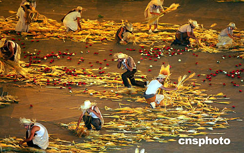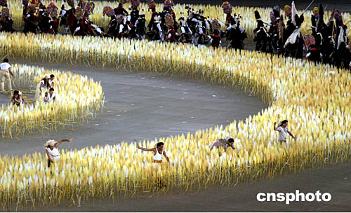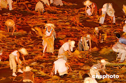 圖為在當(dāng)?shù)貢r(shí)間8月29日舉行的雅典奧運(yùn)會閉幕式中,表演者表演小麥豐收的鏡頭。