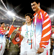 閉幕式上,為中國(guó)隊(duì)打旗的人變成了奪得110米欄金牌的劉翔,他與希臘旗手雙雙走在最前列。姚明葉莉兩人則“藏身”在后邊的大部隊(duì)中,姚明身穿中國(guó)代表團(tuán)的紅色外套,葉莉一身白色T恤,身后寫(xiě)著“相聚北京2008”的字樣。兩人剛進(jìn)場(chǎng)時(shí),姚明甚至親昵地將手搭在女友的肩膀上。身高1.90米的葉莉在身高2.26米的姚明映襯下,顯得嬌小可人。