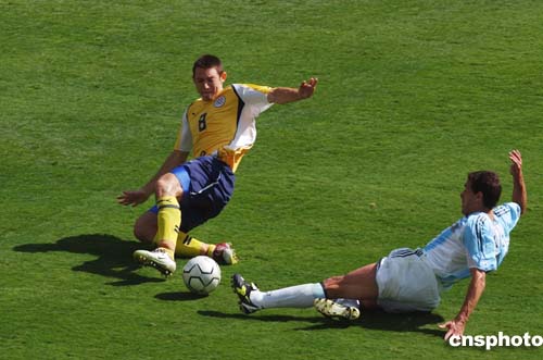 在當?shù)貢r間28日進行的奧運會男子足球決賽中,阿根廷隊以1-0擊敗巴拉圭,獲得冠軍。圖為Cristian Gonzalez與Edgar Barreto激烈拼搶的鏡頭。