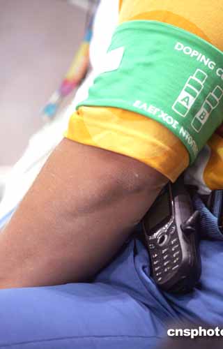 圖為出現(xiàn)在男子4×400米接力賽現(xiàn)場的藥檢人員。