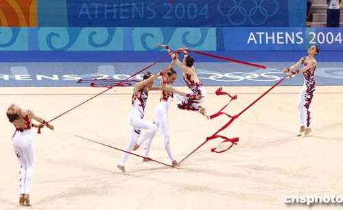 圖為意大利隊在藝術(shù)體操集體全能比賽中的精彩表現(xiàn),她們獲得該項目的銀牌。