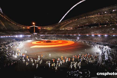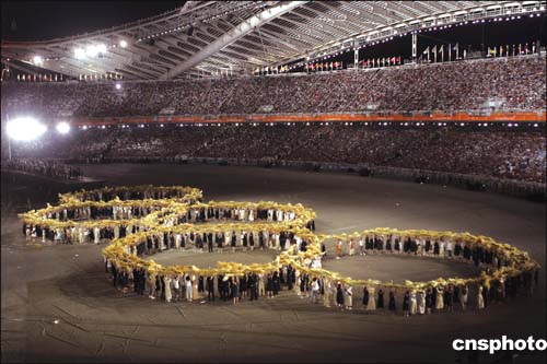 圖為雅典奧運會閉幕式上演員們擺出的各種造型。