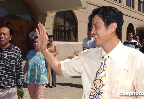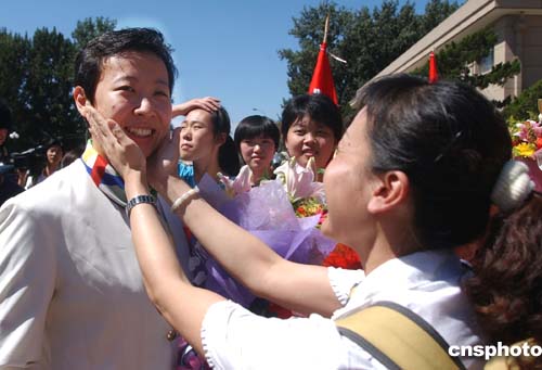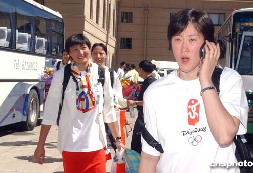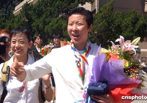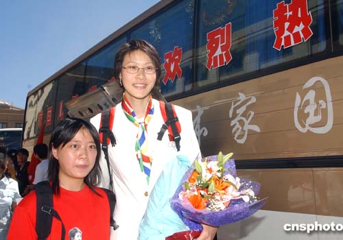 八月三十一日,獲得雅典奧運(yùn)冠軍的中國女排姑娘們載譽(yù)回京,在北京首都國際機(jī)場受到各界熱烈歡迎。中新社記者:武仲林