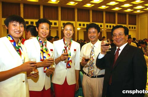 今晚的招待會(huì)上,在雅典奧運(yùn)會(huì)上取得驕人戰(zhàn)績(jī)的中國(guó)奧運(yùn)體育代表團(tuán)的運(yùn)動(dòng)員教練員們、中國(guó)奧組委工作人員和隨團(tuán)采訪的新聞媒體工作人員齊聚一堂,分享勝利喜悅。