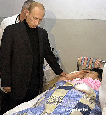 9月4日,俄羅斯總統(tǒng)普京在飛抵北奧塞梯共和國別斯蘭市后安慰一名在人質事件中受傷的婦女。