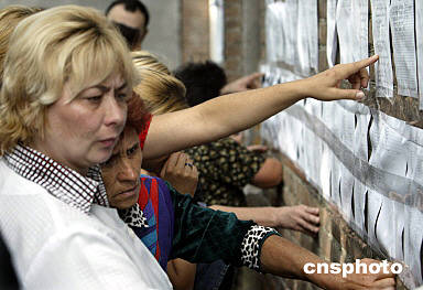 9月4日,在俄羅斯南部北奧塞梯共和國別斯蘭市的一家醫(yī)院,一些群眾在被解救人質名單上尋找親人的名字。