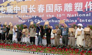 第七屆雕塑展邀請了二十三個國家的雕塑家現(xiàn)場創(chuàng)作了二十六件作品,其中有十個國家尚未與中國建交。圖為部分雕塑家獲長春市政府頒發(fā)的“長春杯”榮譽(yù)證書。