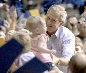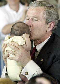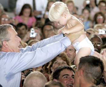 作為一名職業(yè)政治家和總統(tǒng),不論何時(shí)何地,布什都能夠在參加其競(jìng)選活動(dòng)的選民人海中找到這么一兩個(gè)可愛(ài)的貝貝,拿他們作秀,極力表現(xiàn)其親和力。