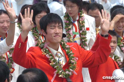 代表團(tuán)在十一時(shí)十五分左右由袁偉民帶領(lǐng)下走出機(jī)艙,緊隨其后的是奧運(yùn)一百一十米跨欄金牌得主劉翔、跳水公主郭晶晶、跳水王子田亮、“蛙后”羅雪娟等廣受香港市民歡迎的運(yùn)動(dòng)員。男運(yùn)動(dòng)員身穿整齊和耀目的西裝,女運(yùn)動(dòng)員則身著大方得體的外套和裙子,他們頸上掛著花環(huán),顯得精神抖擻,不斷向在場(chǎng)歡迎人士露出燦爛的笑容并揮手致意。