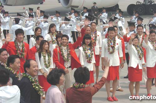中國奧運(yùn)金牌代表團(tuán)在機(jī)場受到熱烈歡迎。中新社記者:錢興強(qiáng)
