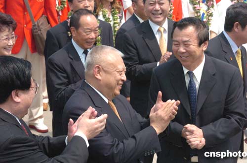 香港特區(qū)行政長官董建華到場歡迎以袁偉民為團長的中國奧運金牌代表團訪問香港。中新社記者:錢興強