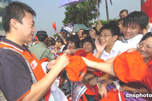 國家奧運(yùn)金牌代表團(tuán)9月7日在香港展開觀光之旅,9時(shí)45分抵達(dá)灣仔金紫荊廣場參觀,吸引大批市民圍觀,圖為馬琳為熱情的香港市民簽名。作者:趙振清