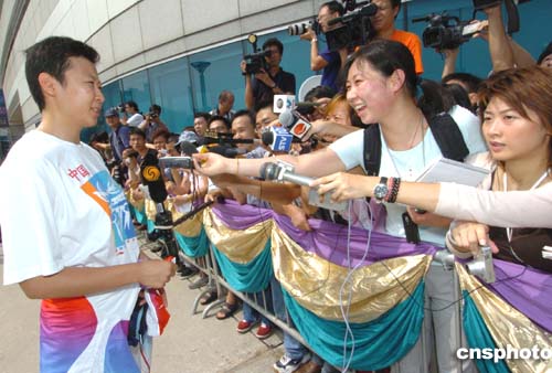 國家奧運金牌代表團9月7日在香港展開觀光之旅,9時45分抵達灣仔金紫荊廣場參觀,吸引大批市民圍觀,圖為女排隊長馮坤現(xiàn)場接受媒體采訪。作者:趙振清