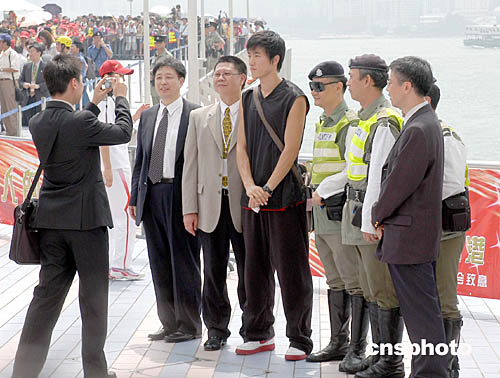 國家奧運金牌代表團9月7日在香港展開觀光之旅,金牌選手分別在香港多處名勝景點參觀,所到之處均深受廣大市民熱烈歡迎,其中“欄王”劉翔在尖沙咀星光大道參觀,交警也邀請他合照。作者:鄧慶樂