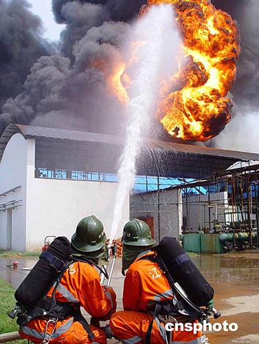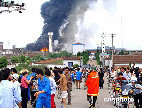 金華市立信醫(yī)藥化工有限公司地處金華市西郊,距市區(qū)十公里。起火部位為該公司五0九車間(阿奇霉素中間體生產(chǎn)車間),因反應(yīng)釜突然爆炸,引燃周圍甲苯、丙酮、甲醇和泄漏的易燃液體等,造成大火。火場濃煙滾滾、燃燒猛烈,同時發(fā)生了第二次爆炸,繼而又連續(xù)發(fā)生多次爆炸,甲苯、甲醇、丙酮等化工原料泄漏燃燒散發(fā)出劇毒氣體。與起火車間相鄰的就是氫氣、溴甲烷等易燃易爆危險品倉庫,極易引起連鎖爆炸,情況十分危急。