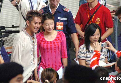 萬眾矚目的“奧運精英大匯演”7日晚上在香港大球場舉行,國家奧運金牌選手和數(shù)萬名香港市民會聚在此,共享中國在雅典奧運會奪金的喜悅和榮光。圖為金牌選手郭晶晶邀請譚詠麟合影。作者:洪少葵