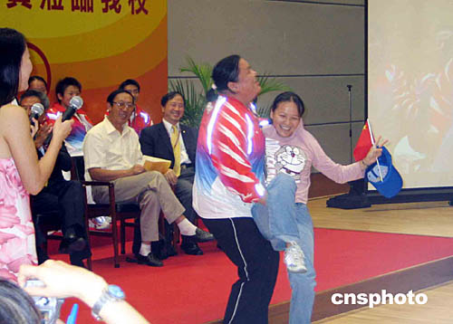 十多名中國(guó)奧運(yùn)金牌運(yùn)動(dòng)員8日到香港中文大學(xué)訪(fǎng)問(wèn),七百多名師生出席歡迎活動(dòng)。期間有學(xué)生要求女子75公斤舉重金牌得主唐功紅抱起她,引來(lái)全場(chǎng)哄動(dòng)。作者:尹丹丹