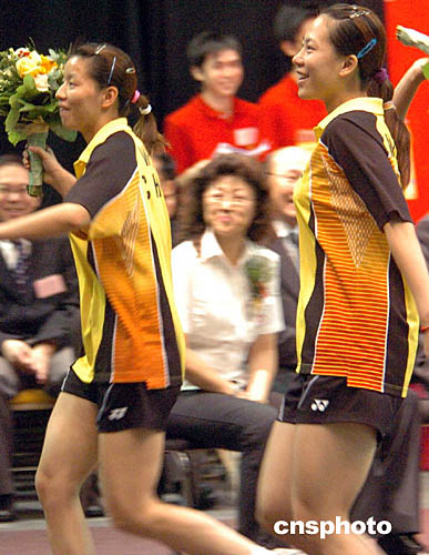 為歡迎國家奧運(yùn)金牌代表團(tuán)訪港,九月八日香港舉行“中國人的驕傲--奧運(yùn)金牌精英顯風(fēng)采”奧運(yùn)金牌羽毛球及乒乓球表演。圖為奧運(yùn)羽毛球金牌運(yùn)動員將鮮花拋向看臺觀眾。中新社記者:錢興強(qiáng)