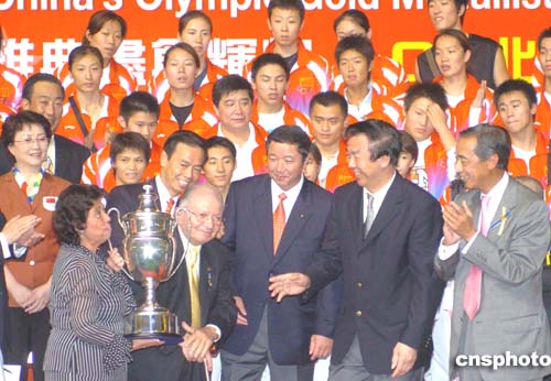 馬會搭設(shè)的頒獎臺上,寫有“0四雅典盡創(chuàng)輝煌,0八北京再顯鋒芒”的字樣,表達了馬會的愿望。代表團團長、國家體育總局局長袁偉民頒發(fā)了獎杯,而全體金牌運動員則登上頒獎臺,列席頒獎儀式。在此之前,全體金牌運動員還在一匹駿馬雕塑上簽名留念。