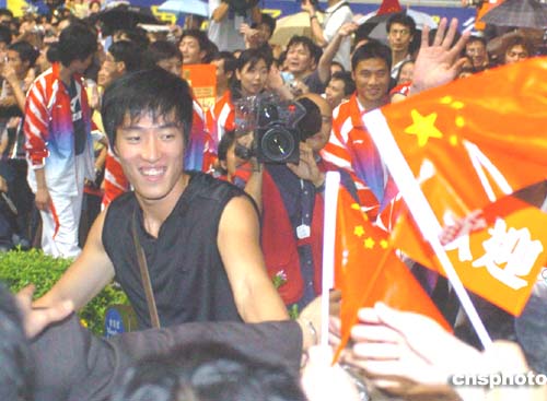 國家奧運(yùn)金牌運(yùn)動員代表團(tuán)9月8日晚在香港跑馬地馬場參觀,“欄王”劉翔所到之處均受到熱烈歡迎。作者:趙振清