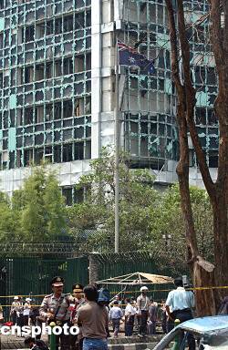 澳大利亞駐印尼大使館和爆炸現(xiàn)場附近300米內(nèi)的高層建筑都受到嚴(yán)重破壞,玻璃幾乎全被震碎,附近的多輛汽車也被毀。澳使館大門被炸出了一個大洞,大門外的圍欄也被炸毀。