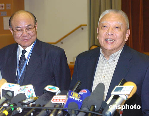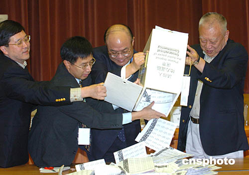 行政長官董建華與選舉管理委員會主席胡國興﹑民政事務局局長何志平12日晚到位于跑馬地黃泥涌道禮頓山社區(qū)會堂點票開箱點票。