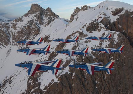 法國空軍的“法蘭西巡邏兵”飛行表演隊正式成立于1964年2月。飛行表演隊的飛機(jī)涂著同法國國旗一樣的紅、白、藍(lán)三種顏色,機(jī)群在空中做飛行表演時也常常把著三種顏色的煙跡留在空中。它象征著“自由”(紅色)、“民主”(白色)、“博愛”(藍(lán)色),體現(xiàn)了法國人民勇敢、浪漫的傳統(tǒng)和對未來美好的愿望。圖為8機(jī)正方形編隊(來源:艦船知識網(wǎng)絡(luò)版)