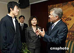 美國(guó)安利紐崔萊第二代傳人山姆.洪邦先生,九月十二日在北京與中國(guó)的雅典奧運(yùn)跨欄冠軍劉翔親切交談,稱贊劉翔是一顆“黃色子彈”。中新社記者:宋吉河