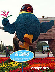 第十三屆金雞百花獎(jiǎng)電影節(jié)將于九月十六日在寧夏首府銀川舉行。在銀川市的光明廣場(chǎng),本屆電影節(jié)吉祥物、寧夏回族自治區(qū)的區(qū)鳥藍(lán)馬雞“藍(lán)藍(lán)”在花叢中異常顯眼。作者:劉呈軍