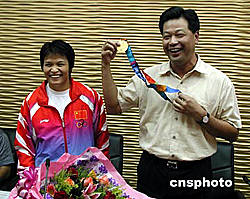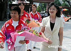| 第二十八屆雅典奧運(yùn)會(huì)女子柔道五十二公斤級(jí)冠軍冼東妹的家鄉(xiāng)——廣東肇慶,九月十三日下午舉行盛大的歡迎儀式,并以六十萬(wàn)元人民幣重獎(jiǎng)自己的優(yōu)秀女兒冼東妹。圖為肇慶市副市長(zhǎng)黃玲陪同冼東妹步入會(huì)場(chǎng)。據(jù)悉,肇慶市委、市人民政府授予冼東妹肇慶市勞動(dòng)模范、“三八”紅旗手、“肇慶市杰出青年”等榮譽(yù)稱號(hào)。同時(shí),四會(huì)授予她四會(huì)市勞動(dòng)模范、四會(huì)“三八”紅旗手、“四會(huì)市杰出青年標(biāo)兵”等稱號(hào);四會(huì)石藝國(guó)際集團(tuán)贈(zèng)送一套高級(jí)公寓給冼東妹。作者:黃耀輝