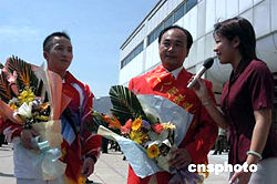 率弟子石智勇、吳美錦在第二十八屆雅典奧運會上分別奪得男子舉重六十二公斤級金牌、五十六公斤級銀牌的著名舉重教練陳文斌(圖中),九月十三日載譽回到家鄉(xiāng)福建,成為當?shù)孛襟w記者爭先采訪的主角。作者:劉可耕