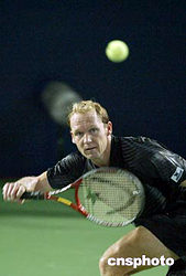 九月十三日,在北京網(wǎng)球中心中央球場(chǎng)舉行的中國(guó)網(wǎng)球公開賽男子單打比賽中,ATP巡回賽排名第二十五位的德國(guó)網(wǎng)球名將舒特勒,以二比零戰(zhàn)勝澳大利亞選手巴卡尼羅,順利晉級(jí)下一輪比賽。圖為舒特勒在比賽中。中新社記者:盛佳鵬